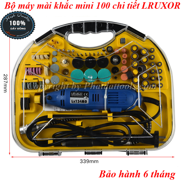 Bộ Máy Khoan,Mài,Khắc Mini LRUXOR 100 Chi Tiết với núm điều tốc 6 cấp độ dễ dàng điều chỉnh theo yêu cầu công việc,có dây truyền động nối dài rất tiện dụng.Lõi động cơ 100% dây đồng công suất 130W có tuổi thọ cao,hoạt động bền bỉ,rất ít lỗi vặt.