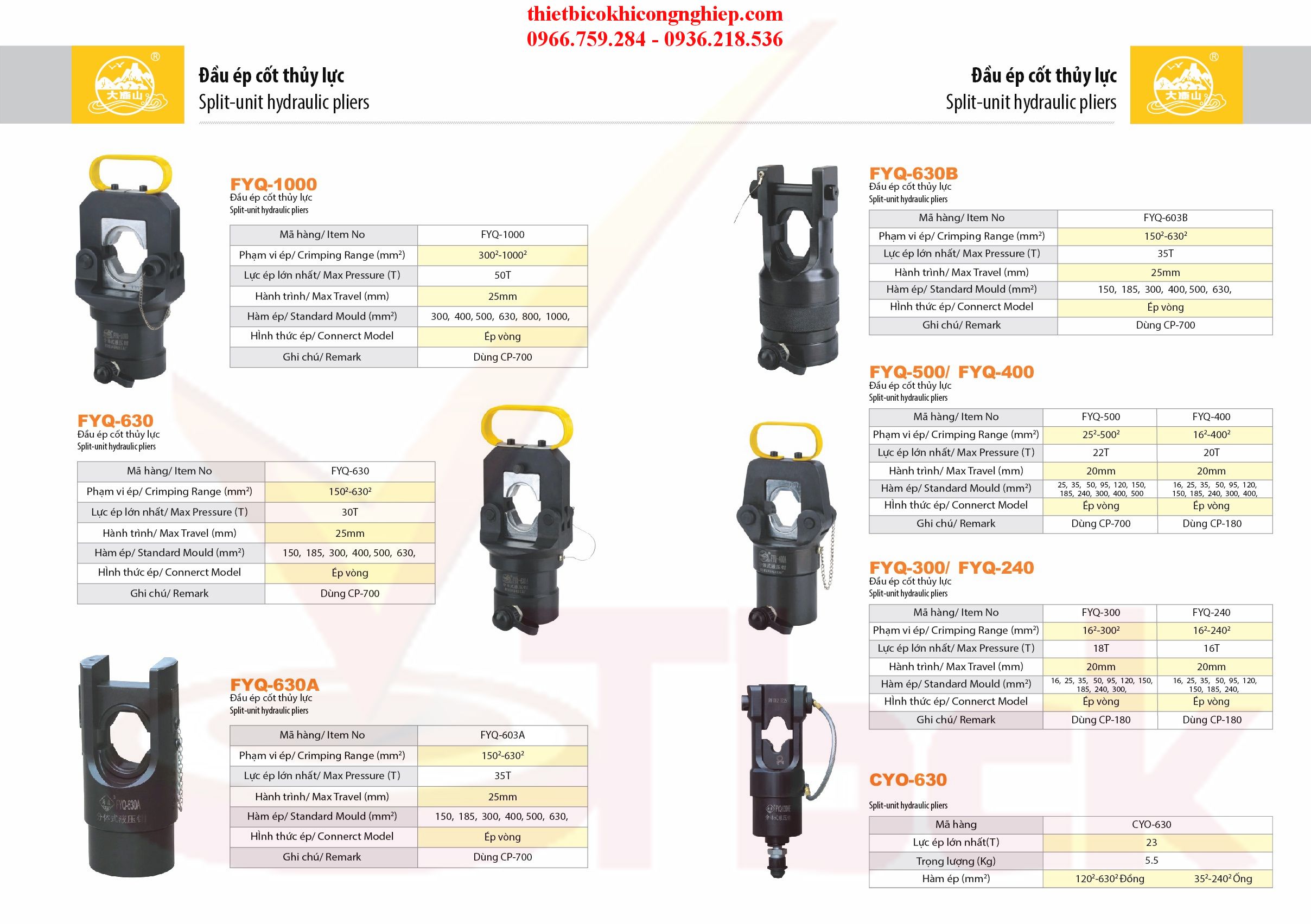 Đầu Ép Cốt Thủy Lực FYQ-1000 dùng để ép chặt đầu cos vào dây cáp. Đầu ép cos thủy lực chuyên dùng để ép các loại dây cáp lớn và cứng mà kìm bấm cos bằng tay hoặc kìm bấm cos thủy lực khó có thể ép chặt. Đầu ép cos thủy lực có thể dùng bơm tay thủy lực CP-700 hoặc bơm máy thủy lực DYB-63F1,DYB-63F2, DYB-63F3