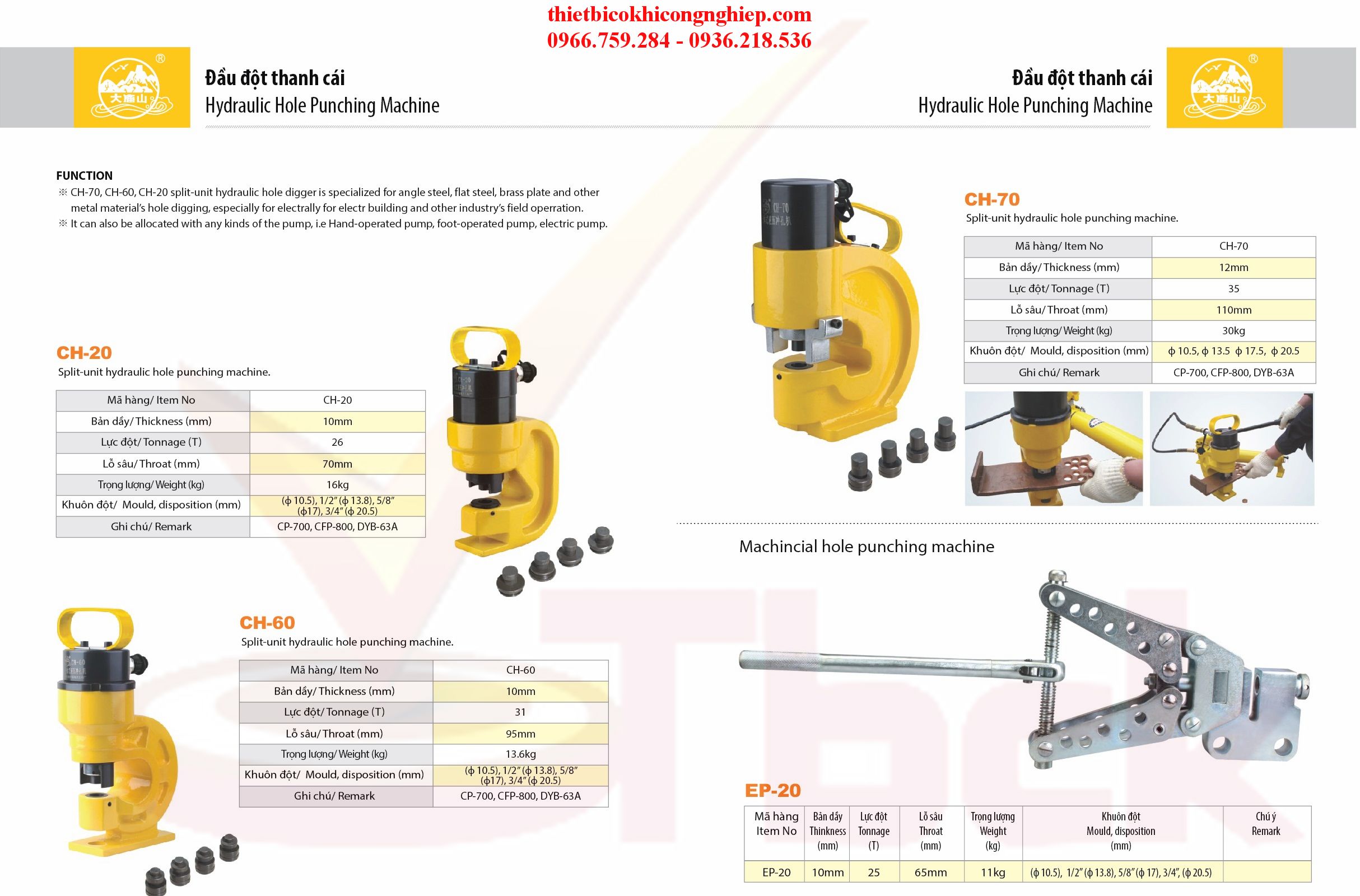 Máy đột lỗ thủy lực có lực đột lên đến 26 - 50 tấn dễ dàng đột được tôn thép có độ dày lên đến 16mm.Các khuôn đột chuẩn của máy là ф10.5), 1/2 "(ф13,8), 5/8 "(ф17), 3/4" (ф20.5) mm , ф25mm