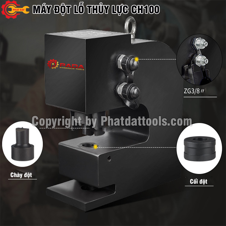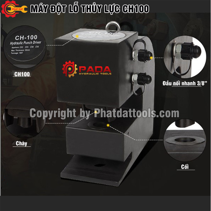 Máy đột lỗ thủy lực CH100 PADA chuyên dùng để đột lỗ trên các vật liệu thép như thép dầm I, thép dầm H, mặc bích hoặc thép tấm (thép có độ cứng trung bình hoặc tương đương mã thép SF400)... Máy đột thủy lực được ứng dụng rộng rãi trong ngành cơ khí xây dựng, gia công cơ khí, nhà thép tiền chế...