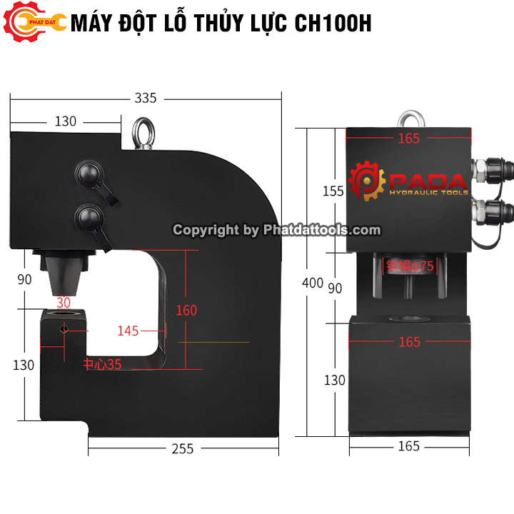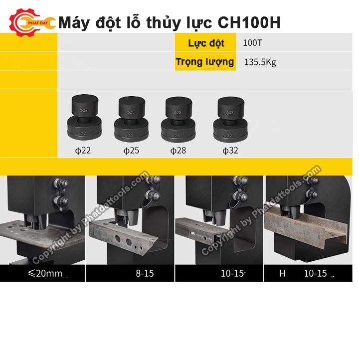 Máy Đột Thủy Lực CH100H PADA có lực đột 100T dễ dàng đột được tôn sắt thanh đồng dày 20mm.Các khuôn đột chuẩn của máy đột thủy lực Ch100H là ф22 – ф25 – ф28- ф32