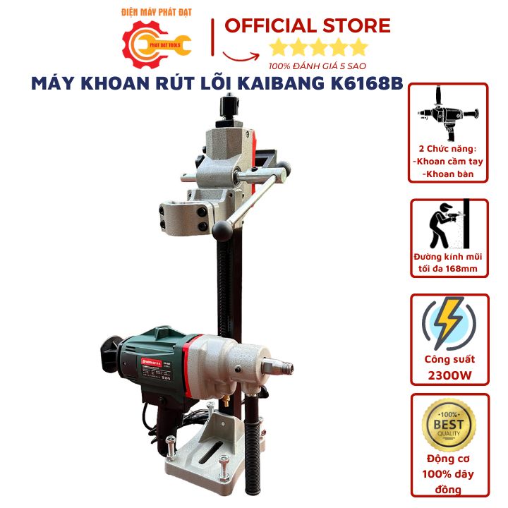 Máy Khoan Rút Lõi KAIBANG K6168B là dòng máy khoan rút lõi chuyên dụng để khoan lấy mẫu betong, tạo lỗ tròn trên sàn,vách betong hoặc tường gạch mà không cần đục phá,không ảnh hưởng đến kết cấu công trình,là thiết bị không thể thiếu trong ngành thi công điện nước,điều hòa,thông gió,chữa cháy...