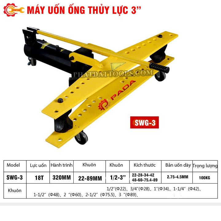Máy uốn ống thủy lực SWG-3 chuyên dùng để uốn ống sắt, thép, inox thành những đường cong khác nhau bằng hệ thống thủy lực.Rất nhẹ nhàng mà không cần điện.Tạo thành nhiều kiểu uốn khác nhau mà không hề khó khăn