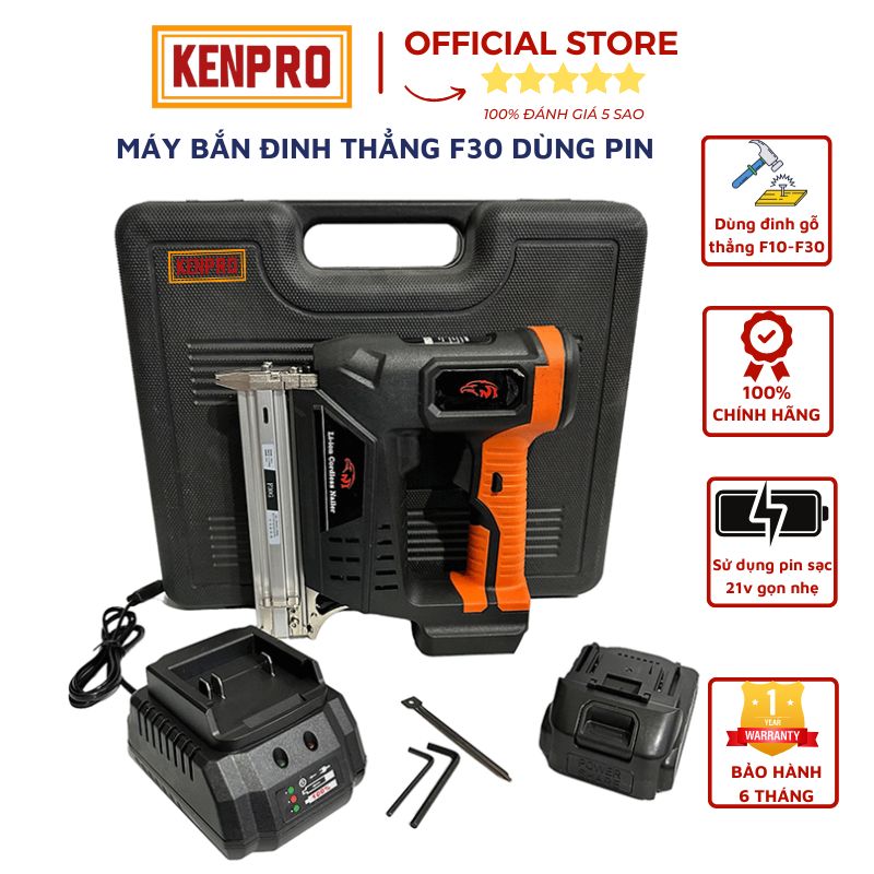 Súng Bắn Đinh F30 Dùng Pin với ray đinh chứa tối đa 100 đinh,khả năng bắn liên tục lên đến 60 đinh/phút,lực bắn khỏe,chân pin thông dụng giống với máy siết ốc,khoan vít,có thể lắp vừa các dòng pin 5 cell,10 cell,15 cell.